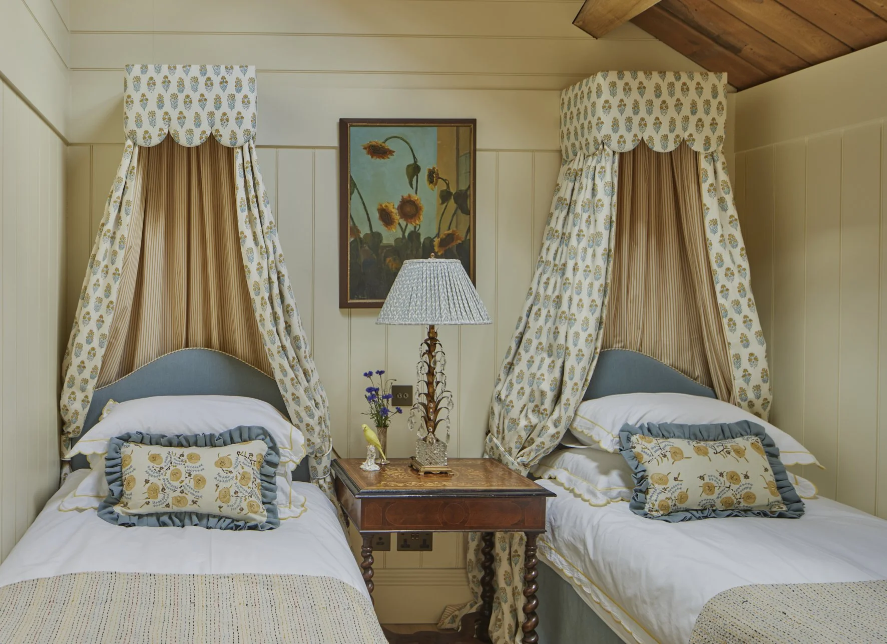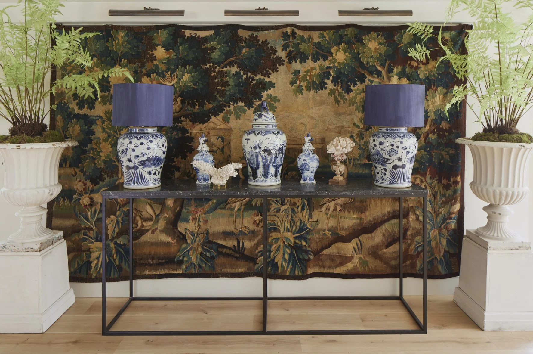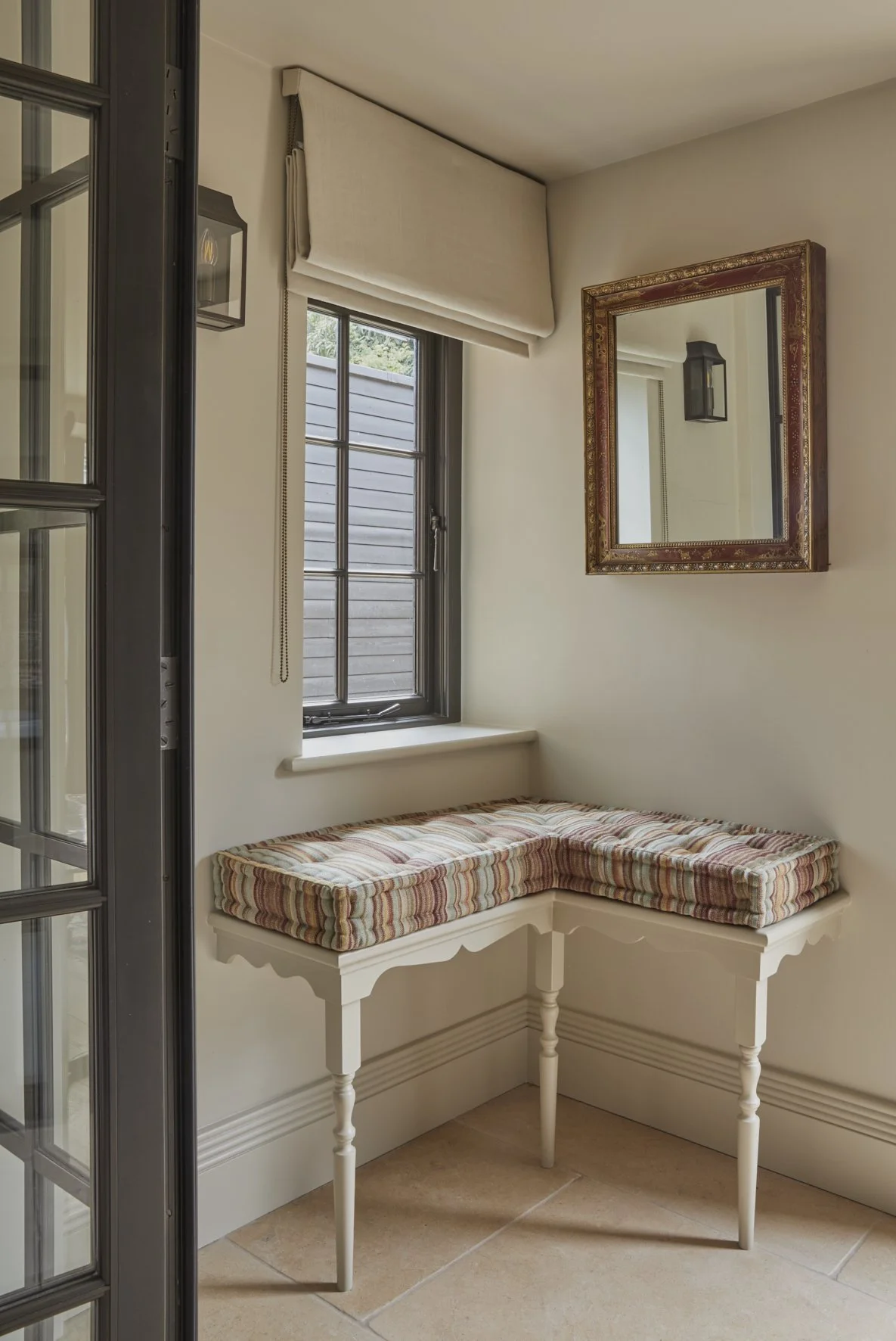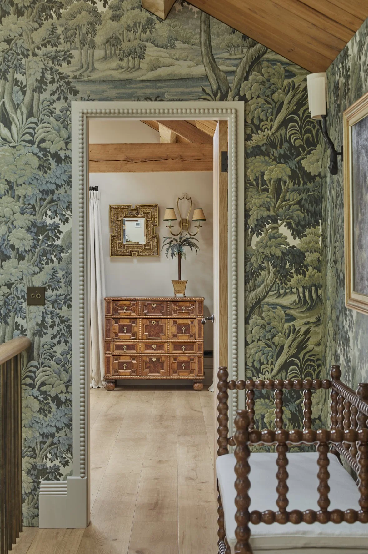 A highlight of the interior scheme is the large landing, where the wallpaper design was inspired by the antique tapestries displayed in both the living space and the master bedroom. Soft furnishings reflect the client’s love for charming fabrics and fine detail, with French curtain poles that beautifully complement the bronze fenestration.