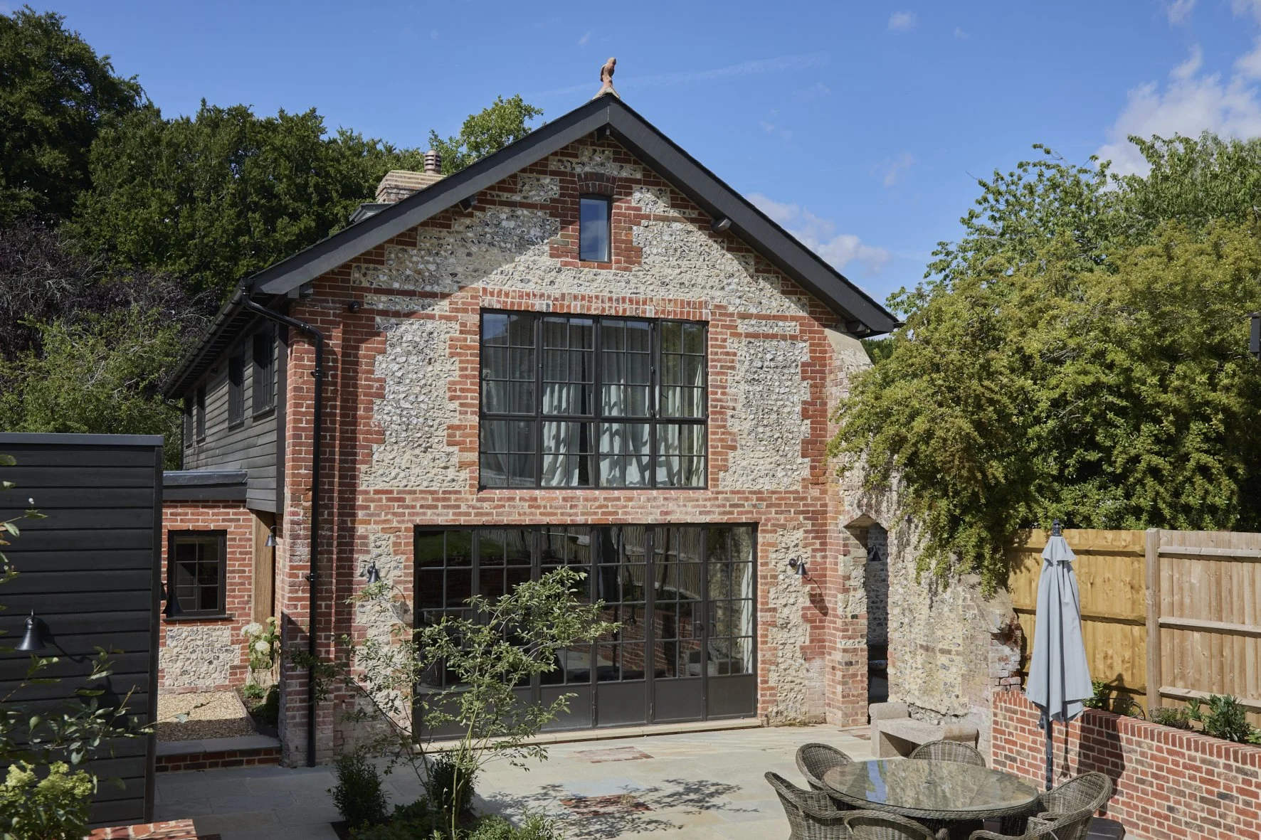 This project involved the complete reimagining of an old granary, nestled in a picturesque village near Winchester, Hampshire. What began as a dilapidated historic structure was carefully deconstructed and rebuilt from the ground up, using traditional brick and flint to honour the heritage of the site while introducing a new sense of permanence and elegance.