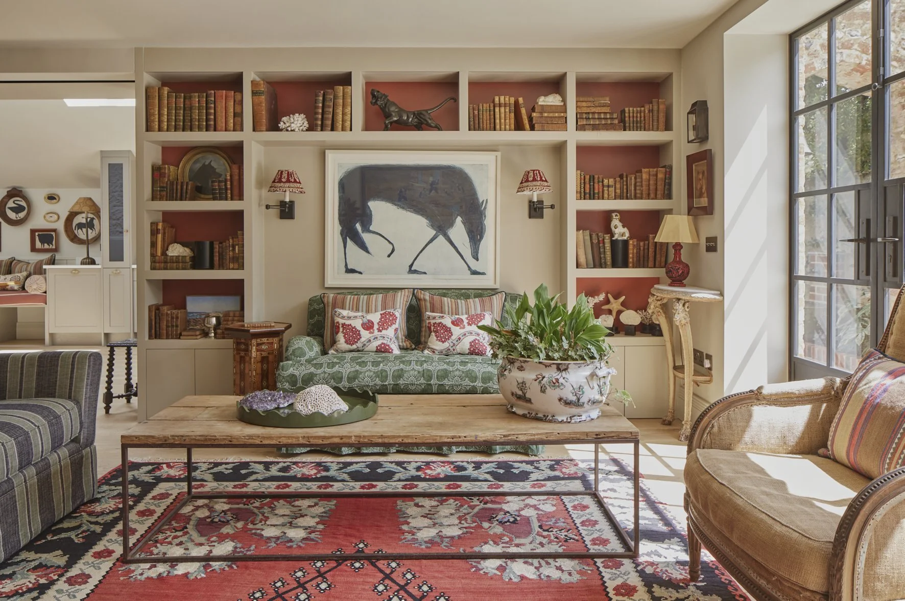 One of the defining architectural interventions was lowering the ground floor to increase ceiling height, allowing the introduction of exquisite bronze casement doors that flood the space with natural light. The interiors were deliberately kept simple and neutral, creating a calm and sophisticated backdrop for the client’s extensive collection of antiques and fine art.